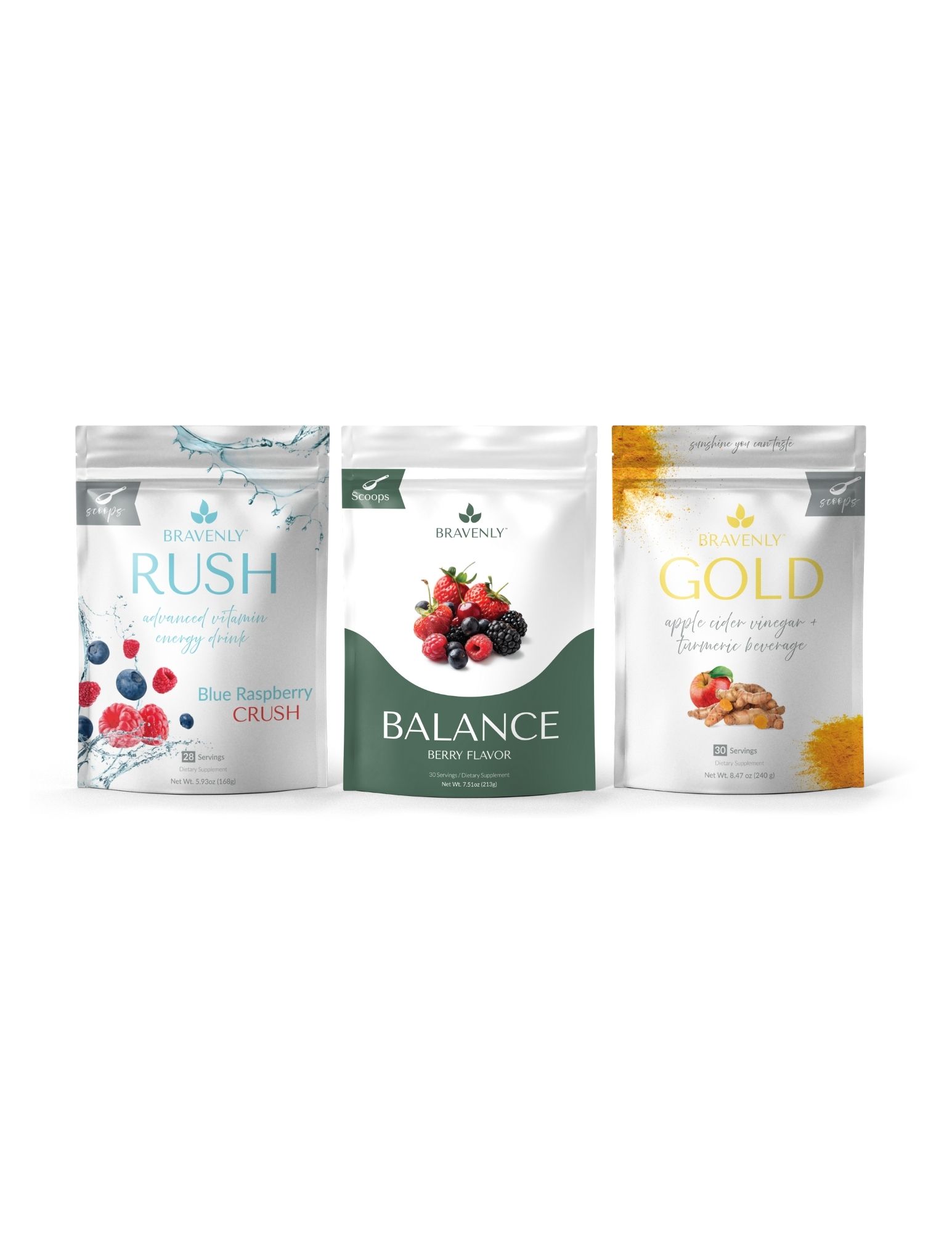 Included: Balance (scoops), Gold (scoops and capsules), and your choice of Rush, Rush Extreme, or Brew Extreme